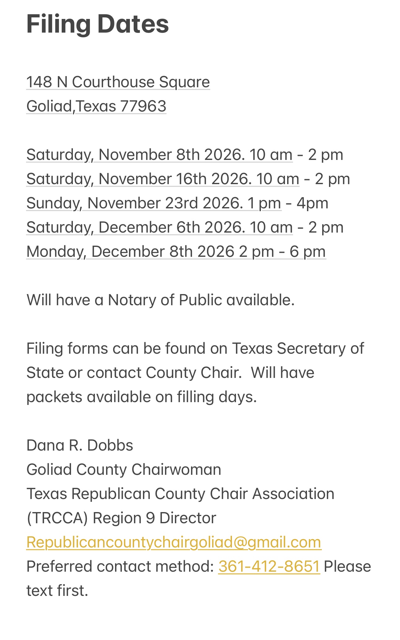 (Para registrarse para votar en el condado de Goliad, puede recoger una tarjeta de registro en la oficina de Administración Electoral del condado de Goliad, en 329 W. Franklin St., Goliad, TX 77963.)
